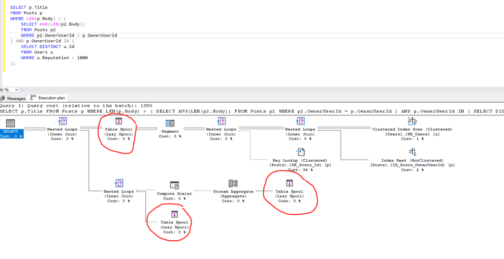 SELECT p.Title FROM Posts p WHERE LEN(p.Body) > (SELECT AVG(LEN(p2.Body)) FROM Posts p2 WHERE p2.OwnerUserId = p.OwnerUserId) AND p.OwnerUserId IN (SELECT DISTINCT u.Id FROM Users u WHERE u.Reputation > 1000);- Note: Complex queries with subqueries and joins might cause a spool operation.